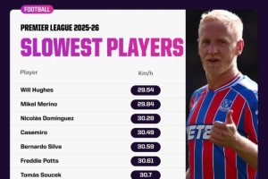 体育资讯4月23日讯 数据机构OPTA统计了本赛季速度最慢的英超球员,梅里诺、卡塞米罗、B席列前五。