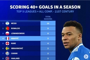 姆巴佩5个赛季进球40+,本世纪五大联赛仅少于梅西、C罗、莱万
