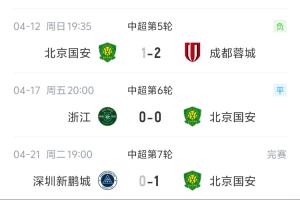 体育资讯04月21日讯 中超第7轮,北京国安客场1-0绝杀深圳新鹏城。此役过后国安终结了球队连续5轮中超的不胜战绩。国安中超首轮客场2-0击败武汉三镇后,随后对阵泰山、申花、铁人、蓉城、浙江连续5轮未尝胜绩。