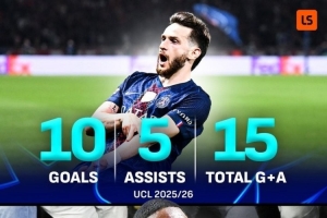 数据统计显示,克瓦拉茨赫利亚本赛季欧冠已经贡献10球5助攻,打破了登贝莱上赛季所创的单赛季欧冠直接参与进球纪录(8球6助攻)。